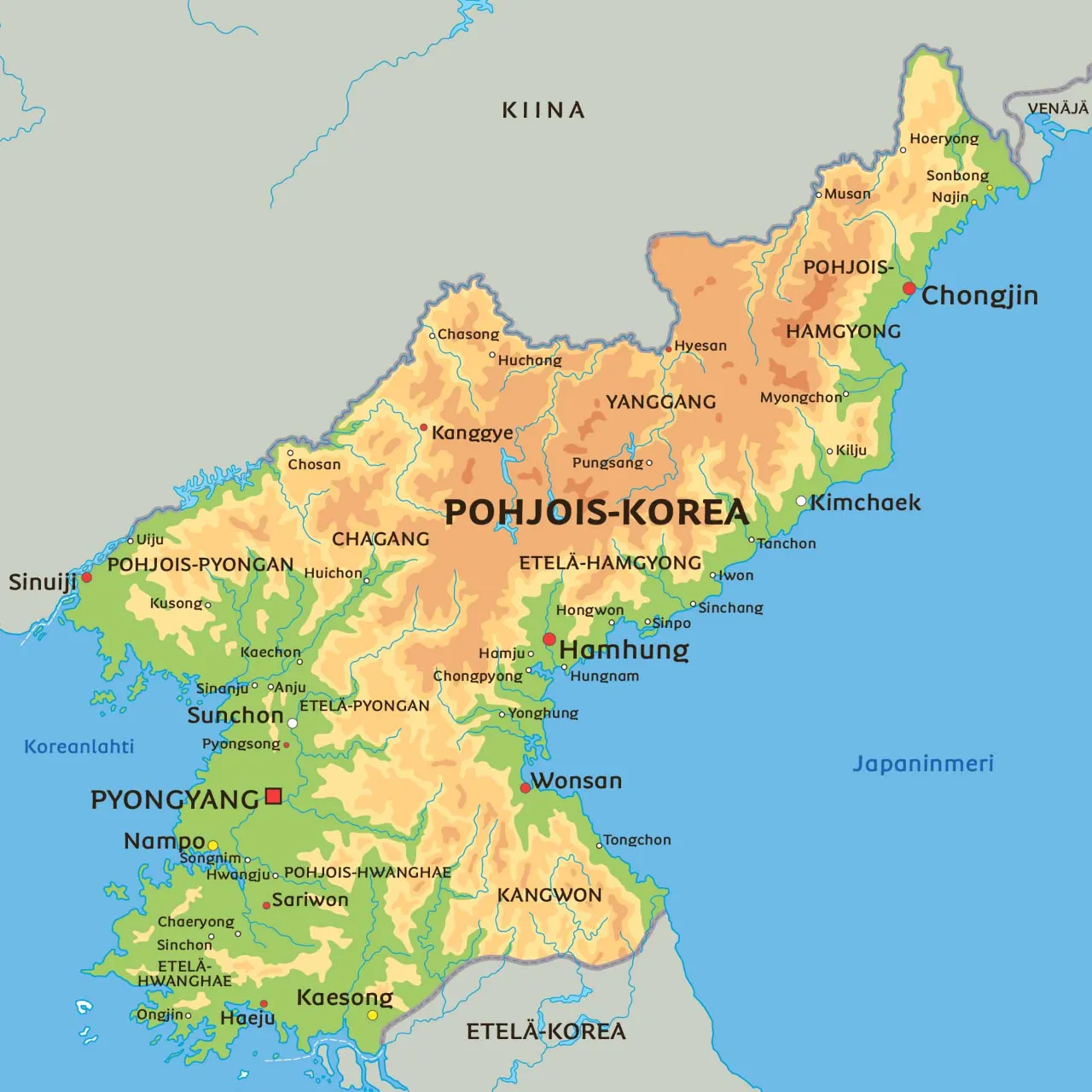 Täältä löydät Pohjois-Korean kartan. Katso esimerkiksi tarkemmin pääkaupunkia Pjongjangia Taedong-joen varrella tai joidenkin suurempien kaupunkien, kuten Chongjiniä Japaninmerellä tai Hamhungia, joka sijaitsee maan itärannikolla, sijaintia. Voit myös löytää Sunjuin kaupungin maan luoteiskulmasta ja Kiinan rajalta. Missä siis sijaitsee pääkaupunki Pjongjangi? Katso karttaa.