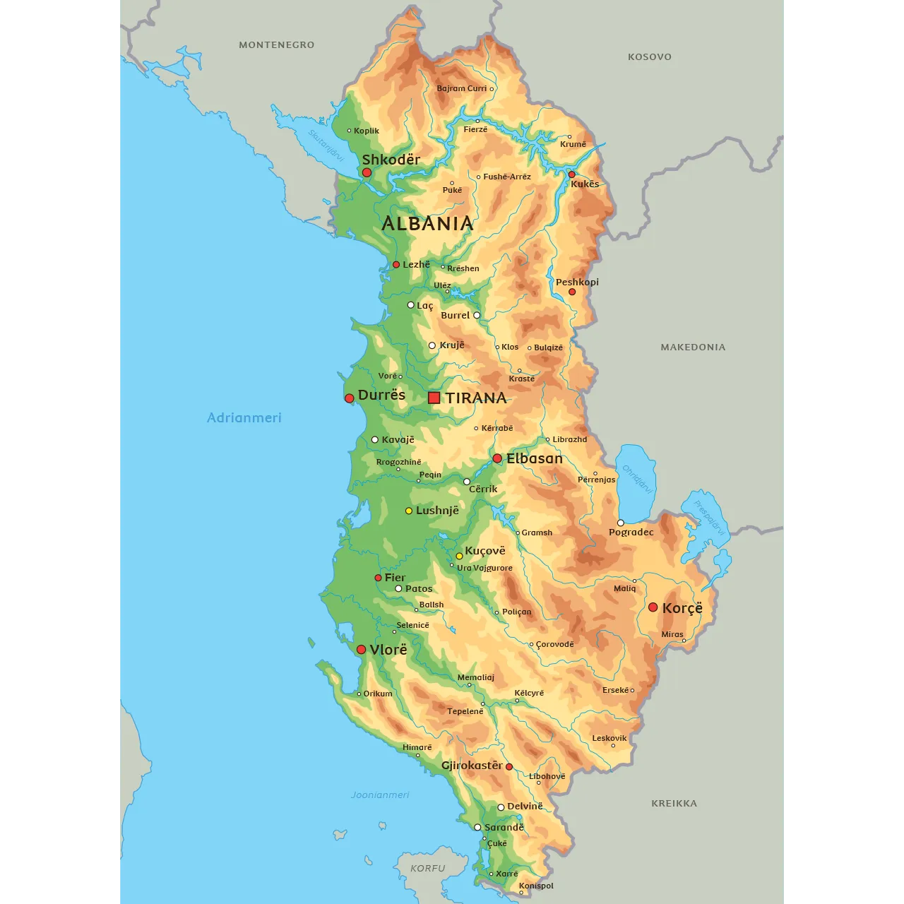 Alta löydät Albanian kartan. Katso muun muassa pääkaupungin Tiranan sijainti, joka sijaitsee maan keskiosassa. Adrianmeren rannikolla voit tutustua Durresin ja Vloren rannikkokaupunkeihin, jotka tunnetaan muun muassa ihanista rannoistaan. Löydä yksi Albanian suurimmista kaupungeista, Shkoder, maan pohjoisosassa, lähellä Shkodër-järveä. Maan eteläosassa löydät Korçën, lähellä Kreikan rajaa. Joten missä pääkaupunki Tirana sijaitsee? Katso se kartalta.