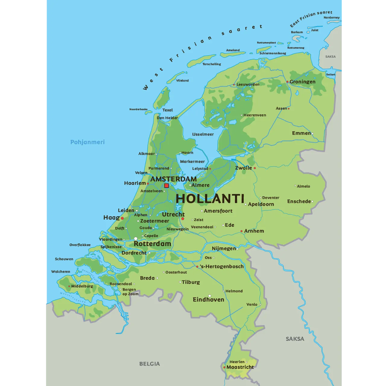 Katso Hollannin kartta tällä sivulla. Näe monet mielenkiintoiset hollantilaiset kaupungit kanavien varrella Amsterdamista tulevaisuuteen suuntautuneeseen Rotterdamiiin ja vanhaan pääkaupunkiin Haagiin. Katso missä voit löytää kaupungin Eindhoven tai Haarlemin Hollannin etelä- tai pohjoisosassa. Nämä kaupungit vievät sinut läpi maan historian ja kulttuurin. Missä voit nähdä kaupungin Amsterdamin? Katso se kartalta.