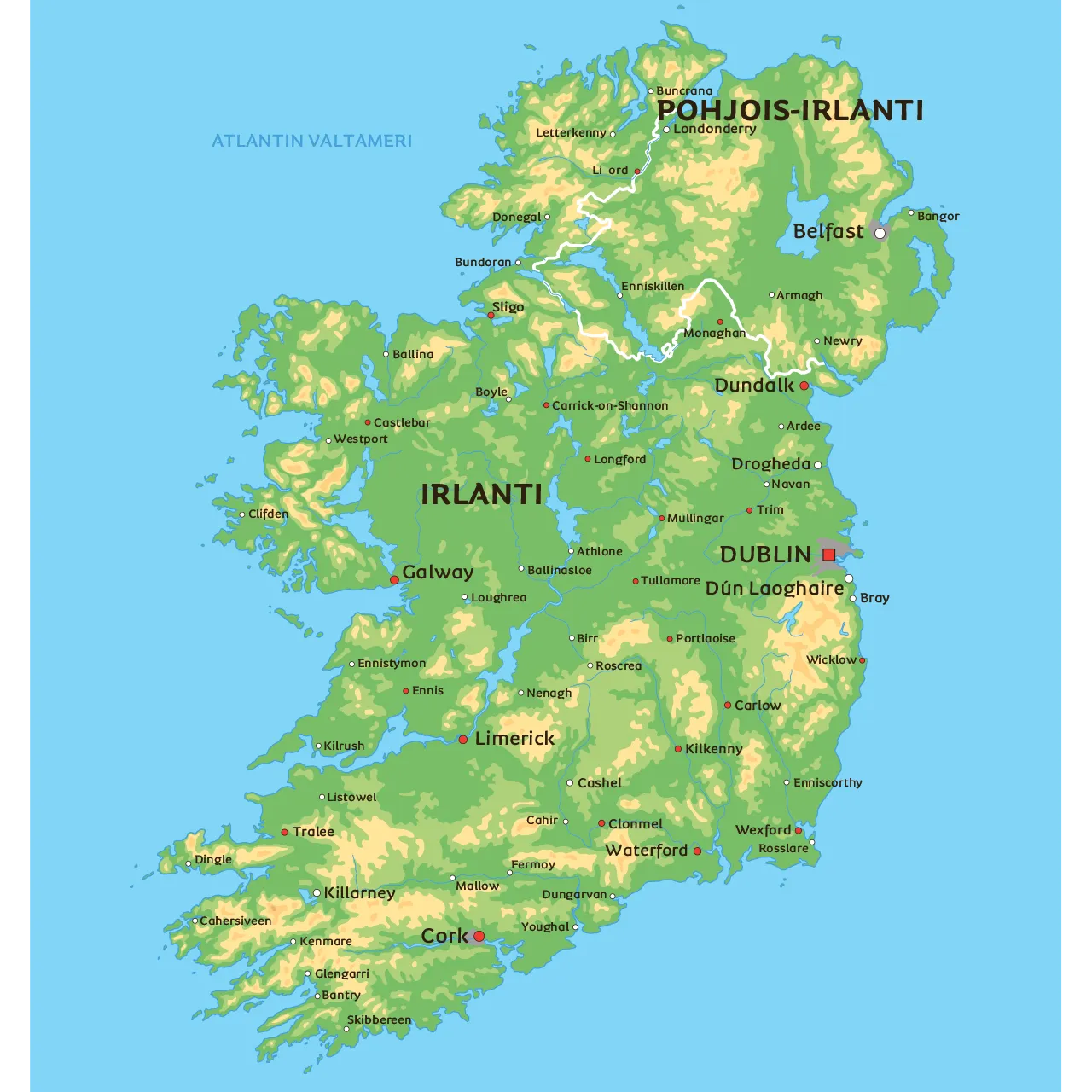 Tältä sivulta löydät Irlannin kartan. Tutustu esimerkiksi tarkemmin pääkaupunki Dublinin ja viehättävän yliopistokaupungin Galwayn sijaintiin. Löydät myös Belfastin sijainnin Pohjois-Irlannissa, joka tarjoaa upeita maisemia. Tutustu elävään kaupunkielämään Corkin kaupungissa, joka sijaitsee Irlannin eteläosassa. Missä sijaitsee pääkaupunki Dublin? Löydä se kartalta.