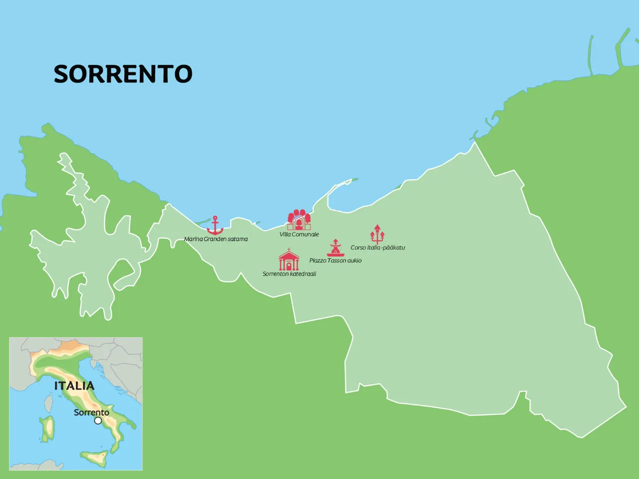 Tutustu Sorrenton kaupunkiin tämän kartan avulla. Löydät muun muassa Piazza Tasson pääaukion, Sorrenton katedraalin ja Corso Italian pääkadun, joka kulkee kaupungin keskustan läpi. Näe myös Marina Granden kalasatama ja nauti lahden näkymistä Vila Comunalen puistosta. Kartta on oppaasi kaupungin nähtävyyksiin. Mistä löydät Sorrenton katedraalin? Katso se kartalta.