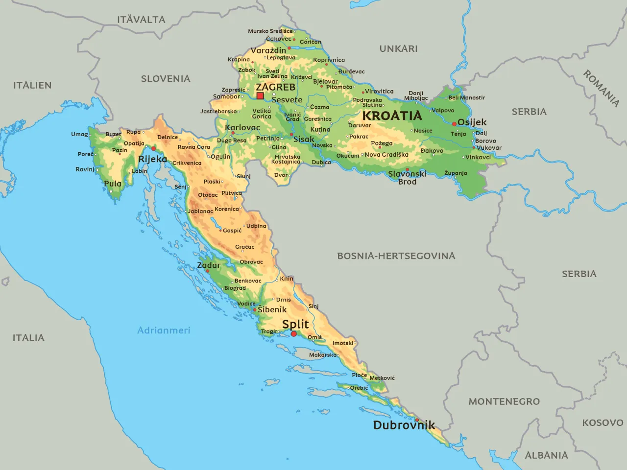 Kartalta näet muun muassa pääkaupunki Zagrebin sijainnin, joka on maan suurin kaupunki ja tarjoaa sekoituksen historiaa, kulttuuria ja kulinarisia elämyksiä. Katso myös, mistä löydät viehättävät rannikkokaupungit Dubrovnikin, Splitin ja Rijekan Adrianmeren äärellä. Nämä kaupungit vievät sinut läpi Kroatian upean luonnon ja kulttuurin.