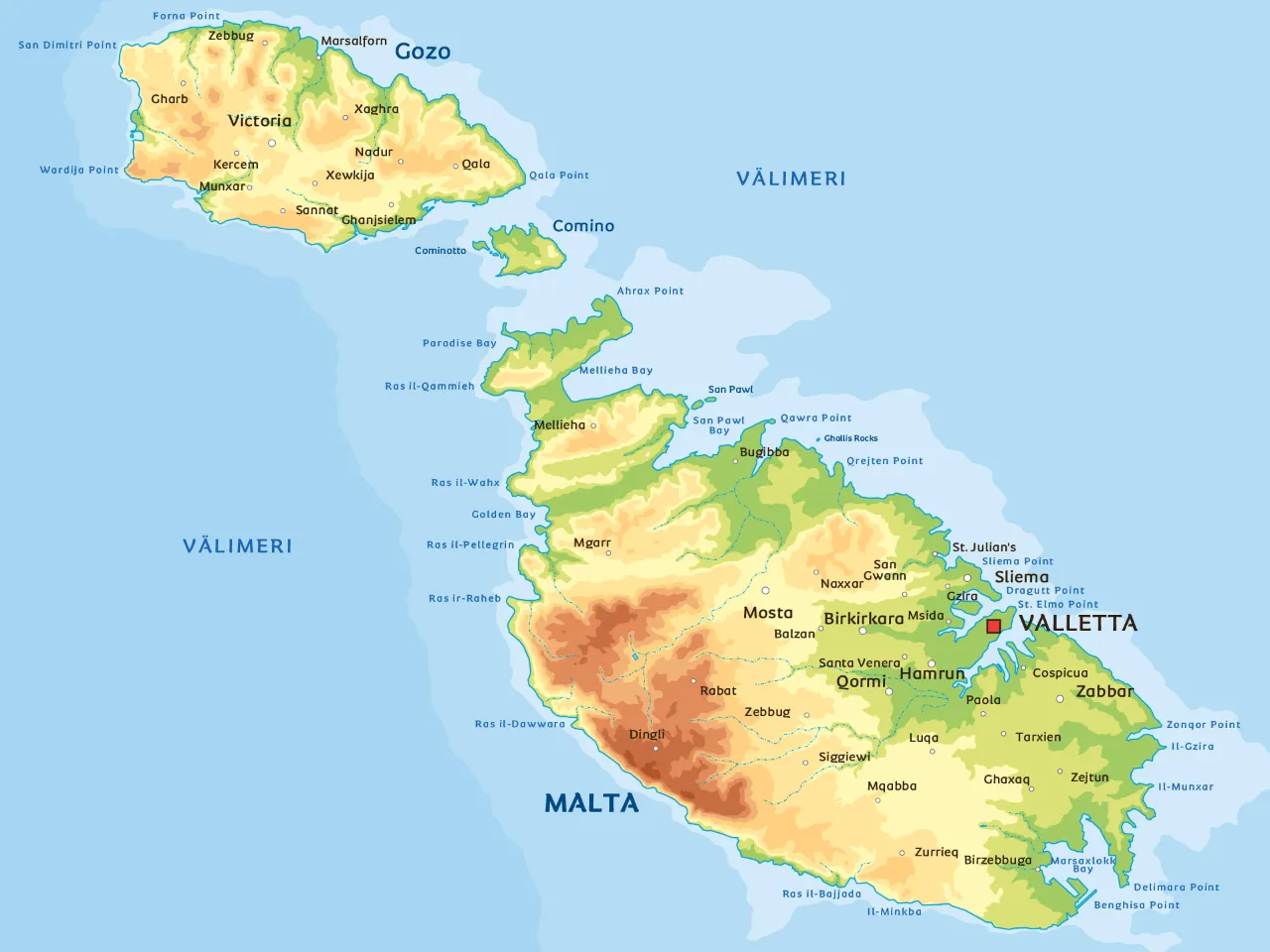 Tässä näet Maltan kartan. Aloita tutkimalla ristiritarien vanhaa saarta täältä ja näe muun muassa pääkaupunki Vallettan sijainti sekä saaret Gozo ja Comino. Katso myös, missä voit löytää Mostan, Slieman tai rannikkokaupunki St. Julianin, jotka johdattavat sinut Maltan kulttuurin, upean luonnon ja paikallisen ystävällisyyden läpi. Missä sijaitsee pääkaupunki Valletta? Etsi se kartalta.