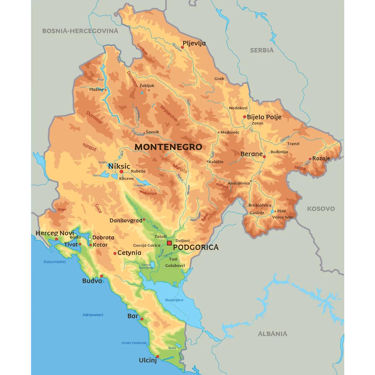 Alla näet Montenegron kartan. Aloita tutustuminen pieneen vuoristomaahan ja tarkista muun muassa pääkaupungin Podgorican ja kauniin Budvan sijainnit. Paikanna myös Herceg Novin ja Tivatin rannikkokaupungit ja maan toiseksi suurin kaupunki Nikšić, jota ympäröivät vuoret.