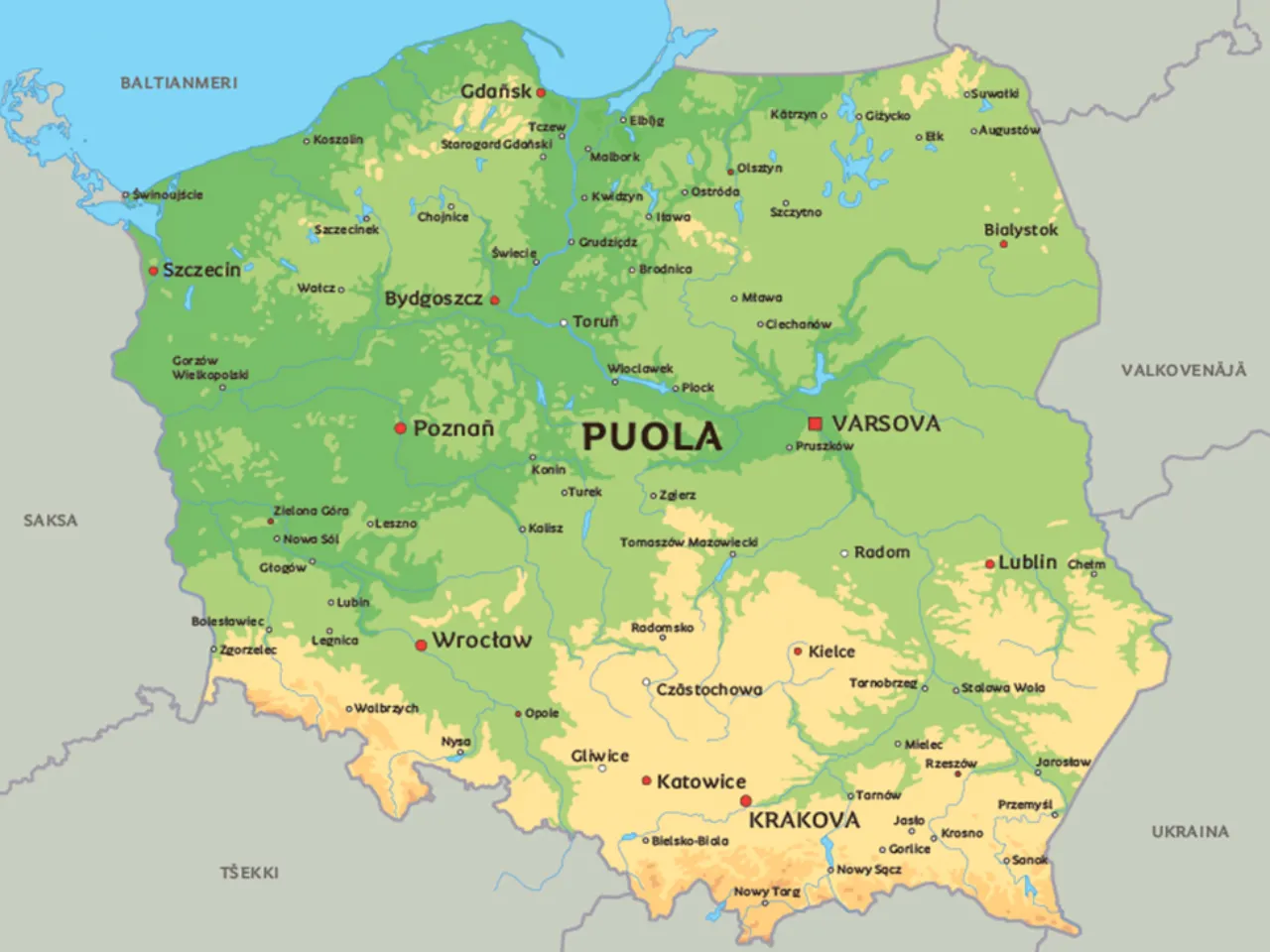Tällä sivulla voit nähdä Puolan kartan. Katso muun muassa, missä voit löytää pääkaupunki Varsovan ja tunnelmallisen Krakovan. Tutustu kaupunkeihin Wrocław ja Poznań, jotka molemmat tarjoavat rikkaan historiallisen ja kulttuurillisen perinnön, tai vieraile Gdańskissa, joka sijaitsee Itämeren rannalla maan pohjoisosassa. Missä sijaitsee Puolan pääkaupunki Varsova? Etsi se kartalta.