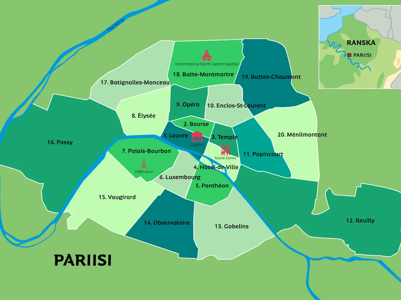 Alta näet Pariisin kartan. Näet muun muassa, missä jotkut kaupungin suosituimmista nähtävyyksistä, kuten Eiffel-torni, Louvre-museo tai Notre Damen katedraali, sijaitsevat. Tutustu Sacré-Coeur-basilikaan viehättävällä Montmartren alueella tai siirry keskustasta länteen Versaillesin palatsiin. Joten missä Pariisissa Eiffel-torni sijaitsee? Etsi se kartalta.