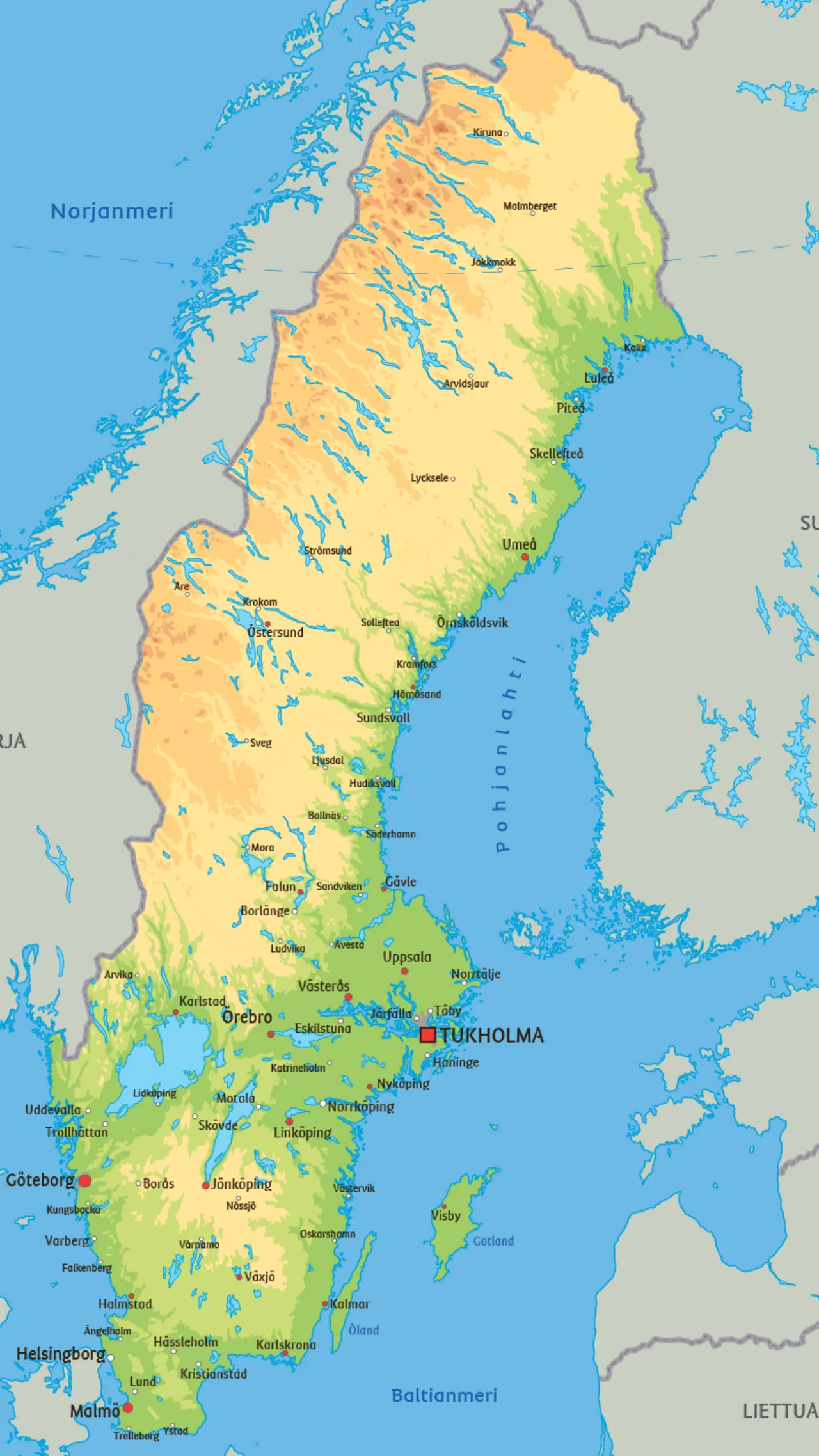 Alla on Ruotsin kartta. Katso esimerkiksi pääkaupungin Tukholman sijainti Ruotsin itärannikolla. Ruotsin eteläosassa löydät kaupungit Malmö ja Helsingborg, kun taas pohjoisosassa voit tutustua kaupunkeihin Luleå ja Kurina. Katso myös, missä Itämeren saaret Gotlanti ja Öland sijaitsevat. Missä voit löytää pääkaupunki Tukholman? Katso se kartalta.