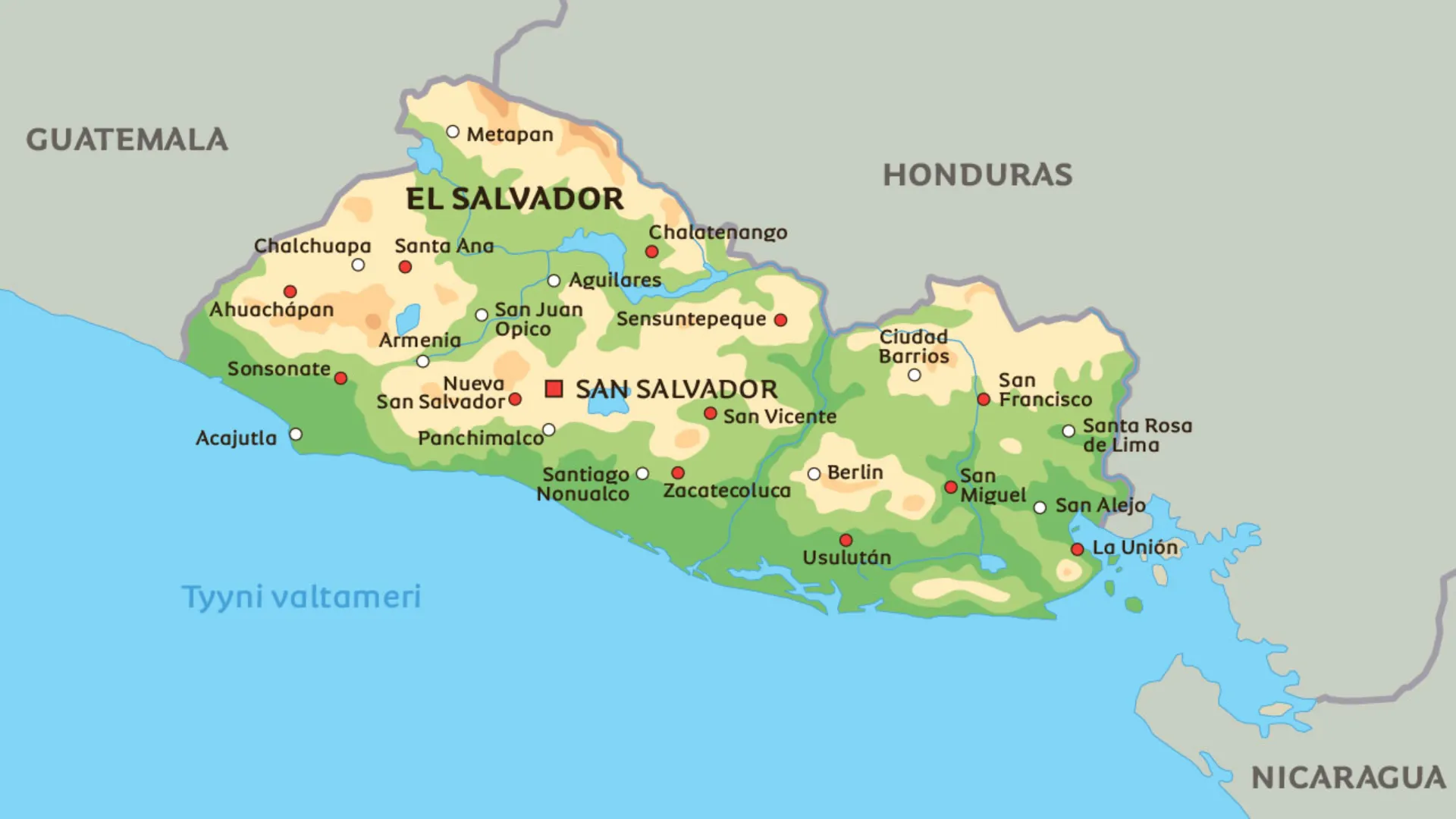 Alla on El Salvadorin kartta. Siinä näet esimerkiksi pääkaupungin San Salvadorin sijainnin.